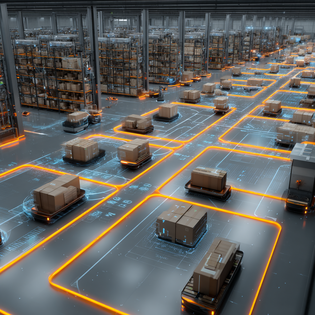 Hệ thống AI điều phối robot trong kho hàng mượt mà hơn, tối ưu vận hành. Ảnh: Midjourney